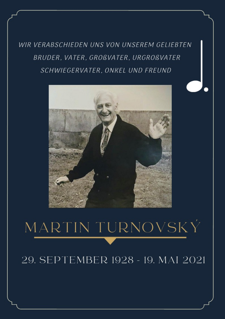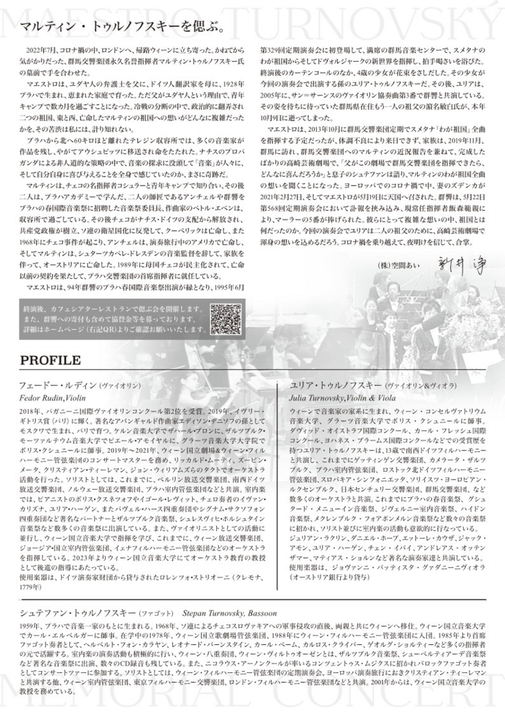 マエストロ・マルティン・トゥルノフスキーは、1928年にプラハで生れ、ドレスデン国立歌劇場管弦楽団の音楽監督、プラハ交響楽団首席指揮者など、また数々の欧米のオーケストラに客演して活躍をされました。94年の群馬交響楽団のプラハ春国際音楽祭の出演が縁となり、95年に群響初登場して、その後群響首席客演指揮者、そして名誉指揮者となり、2021年5月に逝去され、群響の発展に貢献し、群響永久名誉指揮者となりました。当時私は、群響事業局長としてマエストロと親しくさせていただき、初登場から家族のようにお付き合いさせていただきました。 偉大なる音楽家マルティン・トゥルノフスキーを偲んで捧げる、今回の演奏会では、卓越した演奏技術と情感溢れる演奏で、彼らの深い愛と情熱が込められた演奏会になることと確信しております。これこそ音楽を通じて心に平和と希望を届け、マルティン・トゥルノフスキーの音楽が永遠に生き続けることを願っております。 この演奏会を主催者として、皆様のご支援は、演奏者への渡航費の補助、そして遺族の意向により公益財団法人群馬交響楽団に寄付します。