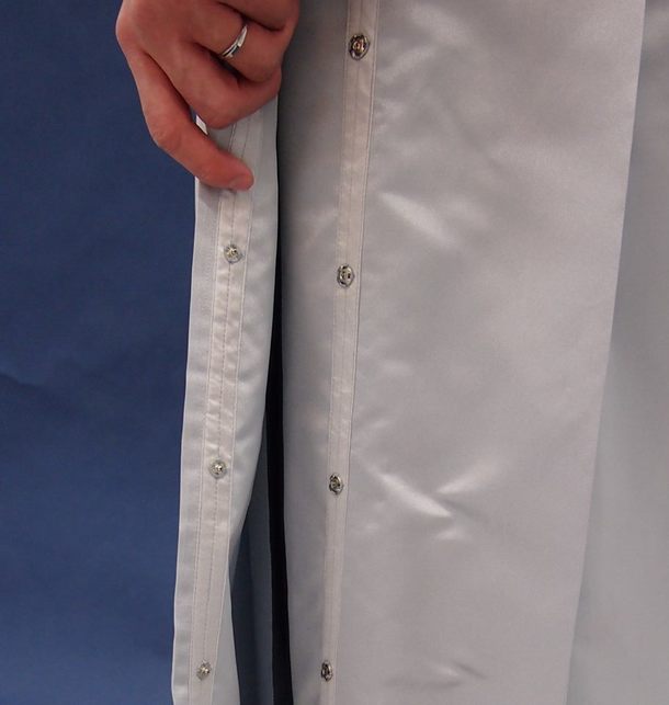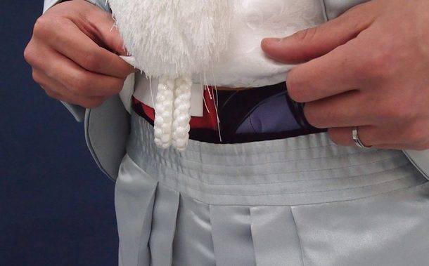 次に、衣装を着用してる際に悩まれるのが、お手洗いですよね。やはり、こちらも長時間となると、大変ですよね。そこで、なんと!袴の両サイドを総あきのスナップ仕様にしてみました。