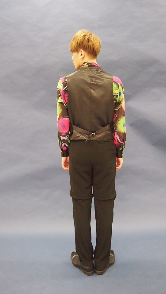 ベストは福岡の伝統的な博多織を使用した生地で、シャツはデザイナーの松本貴大氏オリジナルのテキスタイルで、シフォン系の生地はまるで羽をまとっているような軽い着心地です。