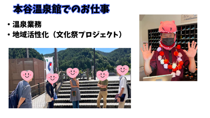 ①愛媛県西条市の本谷温泉館での温泉業務と地域活性化業務(株式会社ありがとうサービス地方創生部所属の契約社員)https://www.arigatou-s.com/