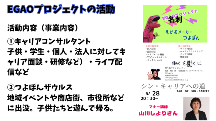 ②キャリアコンサルタントとして、個人及び法人に対するキャリア支援・中高生へのキャリア教育の講師業など(EGAOプロジェクトという屋号の個人事業主)