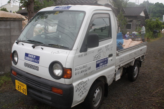 「トラックのマジック書きは消すことにしたから」とVCから。えっ提供車両なのに、なんで? 実は「原発反対」との記述があったようです。確かに原発によってひき起こされた状況なのですが、原発でご飯を食べている方々もいる小高区を走り回っているのは・・・。小高の現状に触れたときでした。VCで消していただき、お手間をかけました。現在の8760は記入なしです。