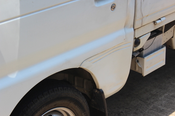 こちらの車は、マツダ。スズキと同じ車体のようです。左のドアには「へこみ」があります。「修理しなくて良いから、このままで車検通して・・・」