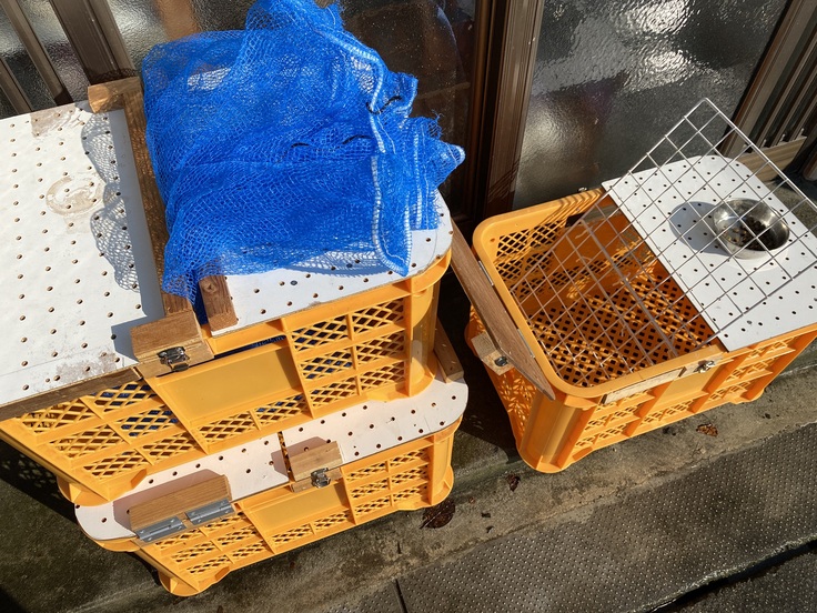 真ん中に少し隙間があって、捕獲網の端を出して縛ったり、半分に仕切って威勢の良いノラちゃんたちに水やご飯を安全にあげたりできます!