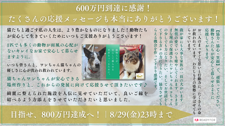 おかげさまで290人を超える皆さまのあたたかいご支援により、8月22日にネクストゴール600万円を達成することができました!!
