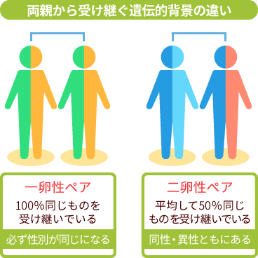 一卵性は1つの卵に1つの精子が受精したあと、その受精卵が2つに分かれて生まれたものです。ほぼ100%同じ遺伝子情報を持っています。性別・血液型ともに同じです。