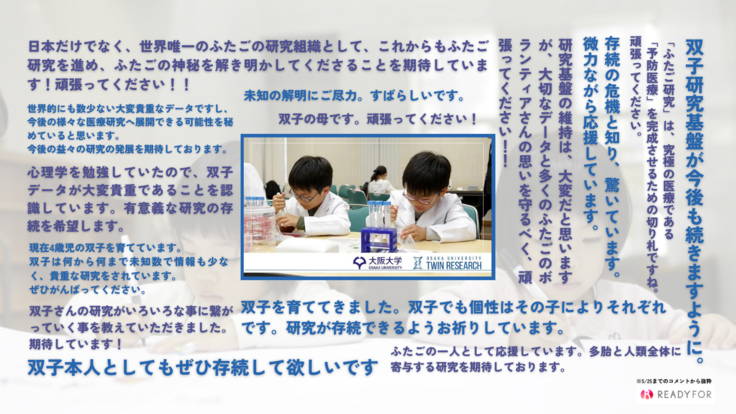 ツインリサーチセンターのクラウドファンディングを応援いただき、誠にありがとうございます。