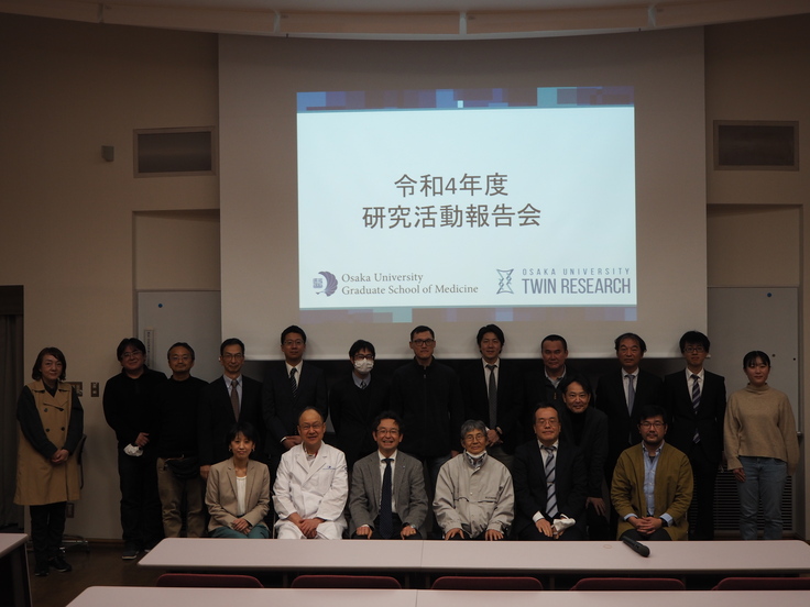 ツインリサーチセンターでは毎年度末に、ふたご研究基盤を用いて行った研究の成果報告会を開催しています。令和4年度も3月に開催し、10グループ以上に及ぶ研究の成果報告・進捗報告がありました。写真は報告会のあと、発表者やセンター関係者による集合写真です。