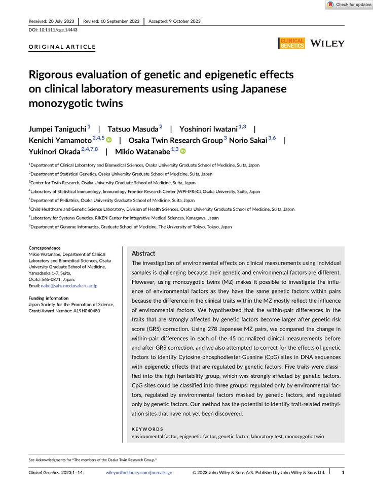 数十種類の臨床検査値の遺伝要因と環境要因の程度を解析し、さらにはそれぞれの検査項目に影響するエピゲノム要因とゲノム要因の関係も解析した重厚な研究です。
