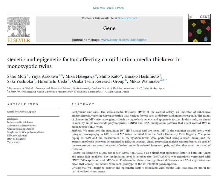 動脈硬化の指標にもなるIMTという頸動脈の壁の厚さを超音波検査で測定し、ふたごで比較するとともに、どういう遺伝因子とエピゲノム因子が関連しているかを明らかにしたものです。