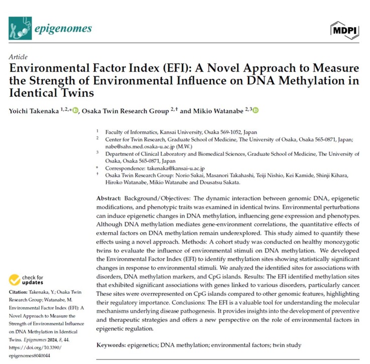 環境因子がDNAメチル化に及ぼす影響を評価した論文です。関西大学との共同研究になります。