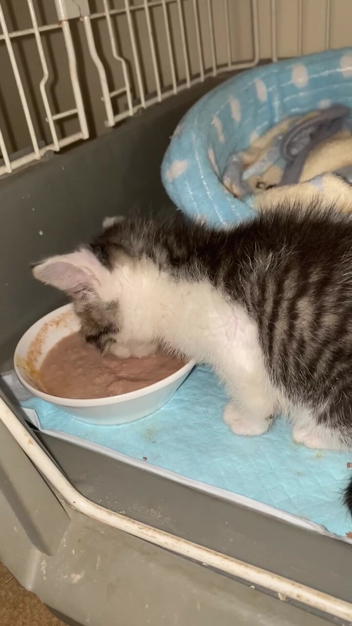 保護してから一番の量のおしっこをしてくれました。脱水症状が改善したことを、受診時にも確認できてひと安心しました。シャンプーをノミの死骸をすっきり落として、段ボールからゲージに移動してもらい、お皿から自分で食べる練習も始め、だんだんと上手になってきました。
