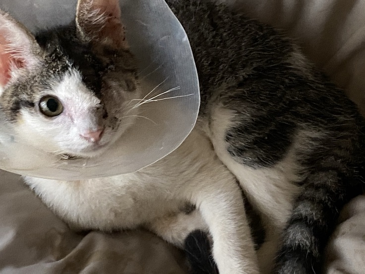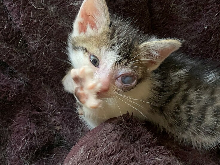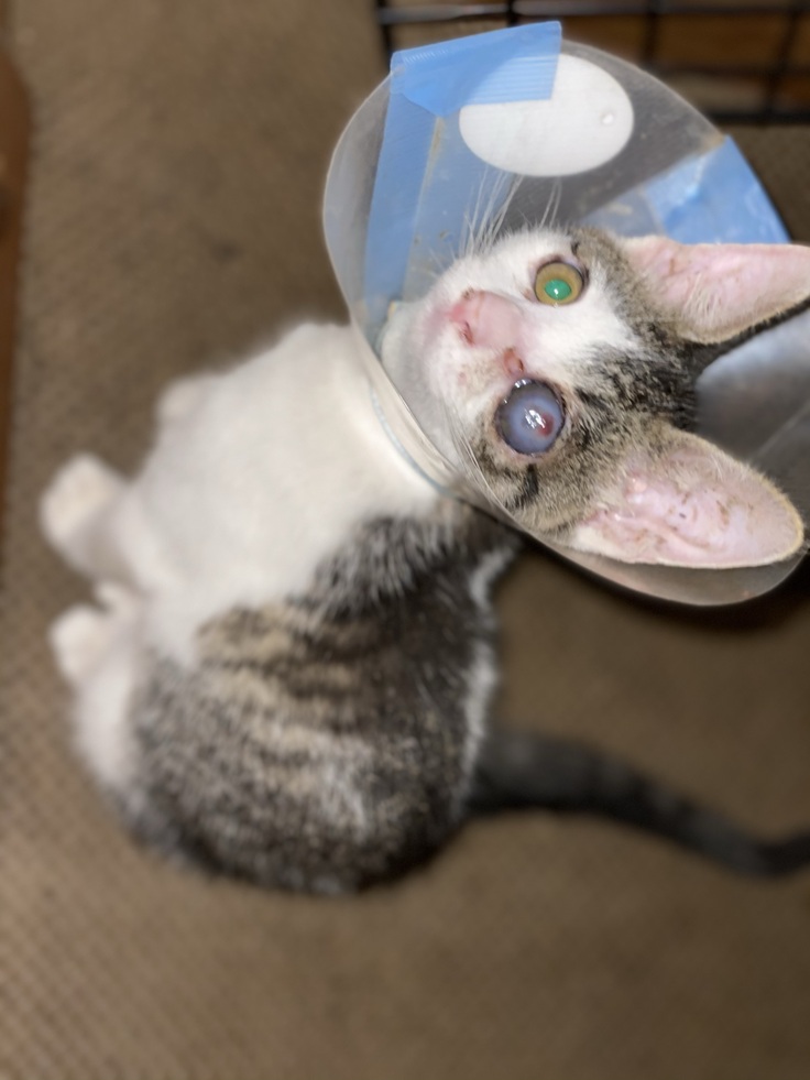 腫れがひどくなると、眼球がせり出してきてしまうので、フードでもなんでも眼球に触れてしまうほどの状態でした。ゲージから出れば、子猫さんパワーで全速力で走り周ったり、高いところに登ったり、目の傷から命に直結する感染症になることを気を付ければならなかったので、ひやひやしながら試行錯誤の毎日でした。