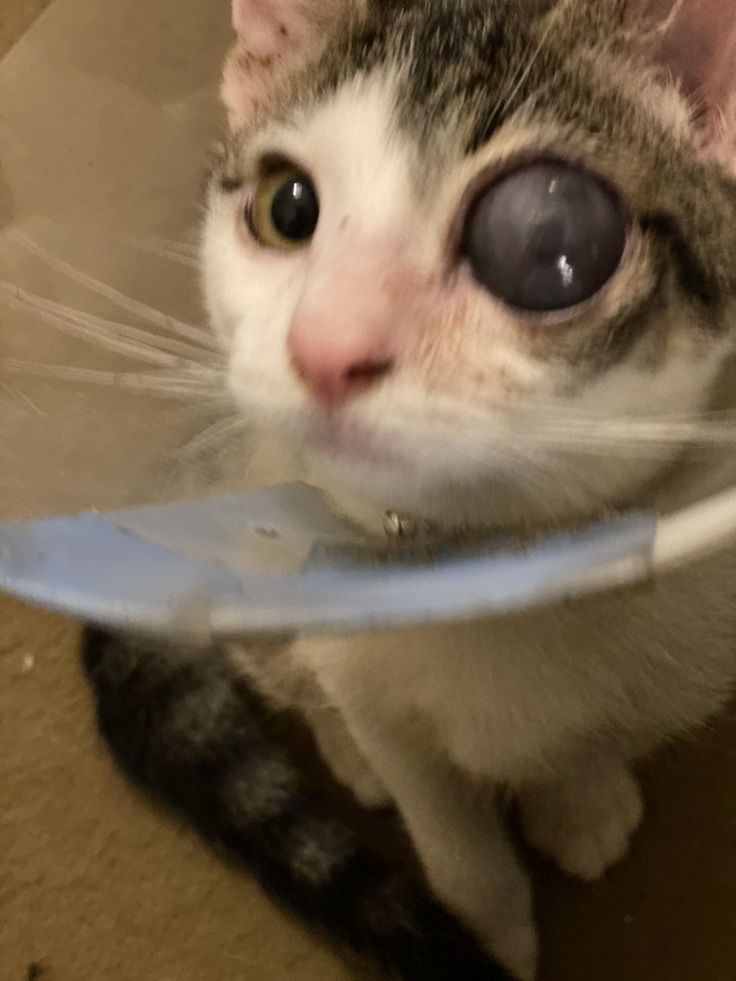 おそらく保護した時点で、既に緑内障に移行してしまっていて、全く見えておらず、QOLのためには早期の眼摘手術が必要との確定診断でした。幸い、右目はきれいな状態とのことだったのが救いでした。