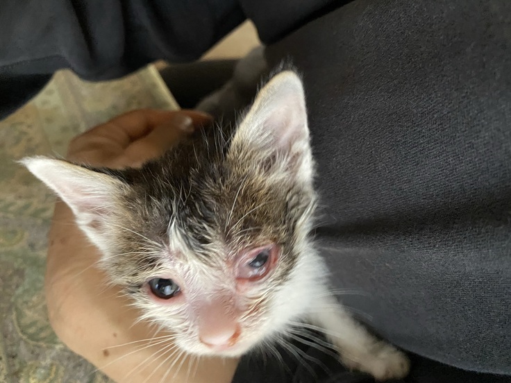 骨だらけの身体はノミだらけで、冷え切っており、脱水症状がかなりあって、ひどい風邪をひいており呼吸が苦しそうなほどの鼻づまりで目は癒着していました。さらに、左目は素人目にも尋常な状態ではないとわかるほど、目の奥から腫れ上がっていました。