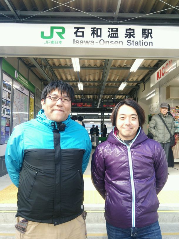 ▲テレビロケでの1枚。JR中央線・石和温泉駅がまだ仮駅舎の時でした。