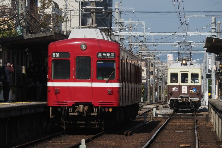 1080形と1300形は連結しての運行ができませんが、長尾線と琴平線でそれぞれ赤い電車が走り、高松築港から瓦町の区間では赤い電車同士のすれ違い風景も楽しめます。