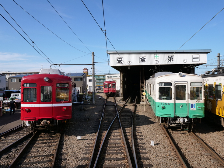 ▲仏生山で並ぶ2本の赤い電車と緑の1305編成