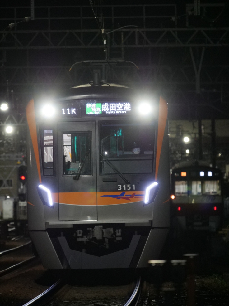▲留置されている京急車両をバックに成田空港へと向かう京成3150形