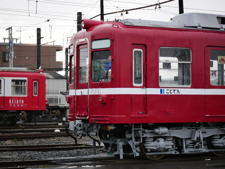 ▲先にことでんの赤い電車となっていた京急羽田20周年ラッピング車との顔合わせ