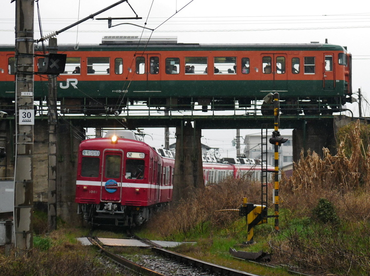 ▲JRの団体臨時列車とことでんの団体貸切列車が交差する