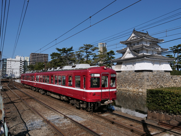 ▲玉藻城と還暦の赤い電車