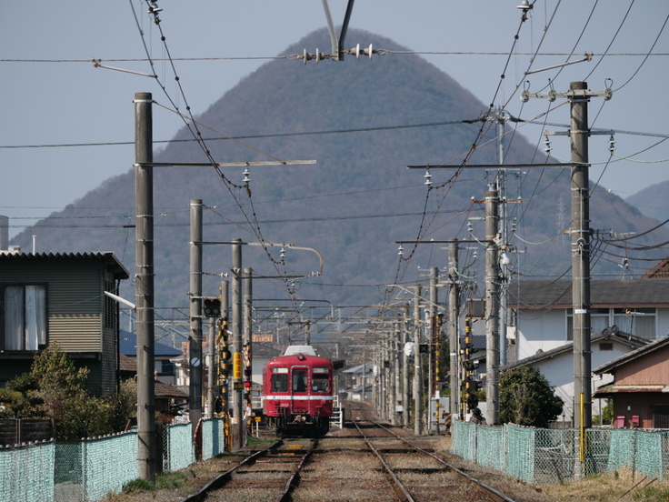 ▲四国らしいきれいな三角の山と還暦の赤い電車