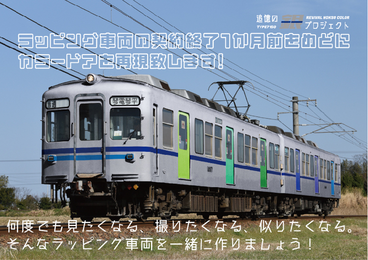 プロジェクトが成立しますと2024年5月から約1年間の予定で、北総7150形リバイバルカラー追憶の銀の電車がことでん琴平線を走ります。
