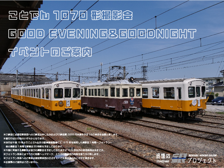 ※当日は午前10時よりことでん仏生山駅東側留置線にて1070形を使用した撮影会1時間~フォトラン~夜の撮影会1時間で解散は20時頃を予定しております。
