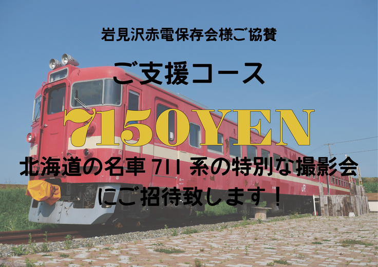 岩見沢赤電保存会様協賛 ◆北海道の赤い電車711系の特別な撮影会にご招待致します。 ※24年5月頃に北海道岩見沢市にて開催予定です。現地までの旅費や宿泊費などの経費はご負担ください。開催についての詳細はREADYFORメッセージにてご案内致します。ご参加が難しい場合のご返金は致しかねます。 ※このリターンには当プロジェクトで製作するラッピング車両デザインの品物、およびその車両を使ったイベントは含まれませんので予めご承知おきください。