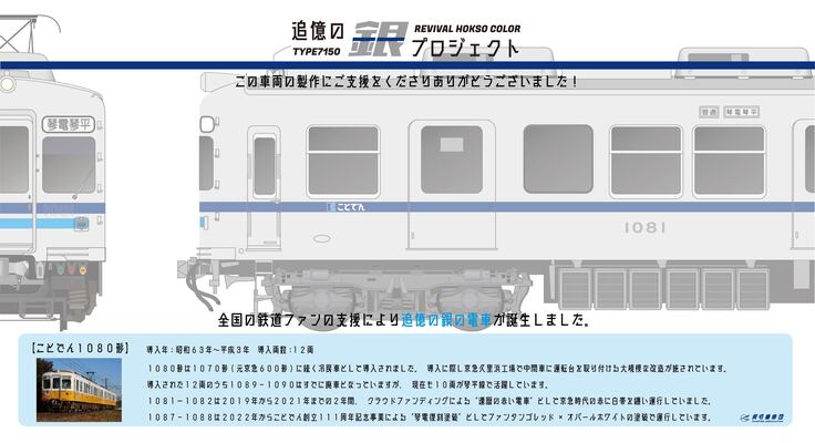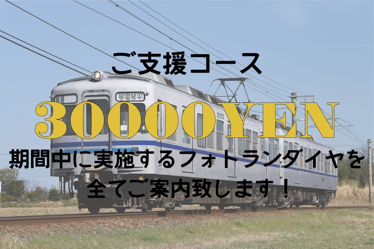 ◆追憶の銀の電車運行期間中に実施するラッピング車両単独の撮影会イベントのご案内をREADYFORメッセージにてお送り致します。 ※イベントは2024年5月以降に香川県高松市で実施致します。開催日は決定次第READYFORメッセージにてご案内致します。現地までの交通費、宿泊費はご負担ください。イベントが急遽中止となる場合、貸切乗車団では一切の補償を致しかねますのでご了承ください。スケジュールが合わずご参加が難しい場合はラッピング車両を使用した別のイベントのご案内をさせて頂きます。 ーーーーーーーーーーーーーーーーーーーーーーーーーーーー ◆ラッピング車両の車内額面にご支援者様の御名前を掲出致します。(ご本名でなくても構いません) ーーーーーーーーーーーーーーーーーーーーーーーーーーーー