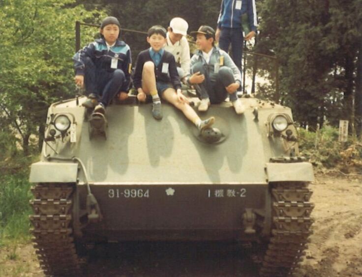 こちらの写真はREADYFOR九五式軽戦車2022公式ページの自己紹介で使った、小学校5年、または6年生の時に訪問した駒門駐屯地での一コマです。左側のY君とは今回のクラウドファンディング実施中にこの話で懐かしいねと盛り上がって、呑みに行っちゃいました。そんな効用もクラウドファンディングにはありますね。