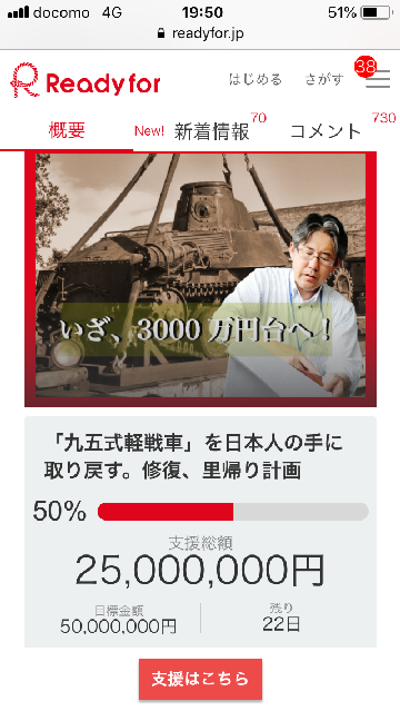 再びあの戦車と会ってみたいと思う気持ち、日本に帰国し安住の地を得て欲しいという気持ち、貴重な産業技術遺産として日本の技術史を伝えていって欲しいとの様々な思いから少額ながら参加させていただきました。