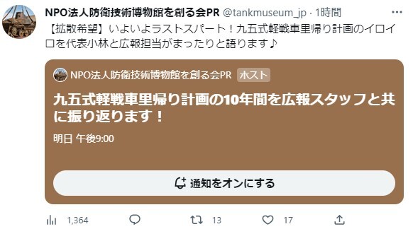 年末の月曜日の23時終了ということもあり、前回の様にスタッフが御殿場に集まってyoutubeライブ中継という訳にも行かないので、今回はtwitterスペースで実行者小林と広報担当の加藤さん、小寺さんと、2011年NPO発足以来の懸案事項であった九五式軽戦車里帰り計画についてじっくり語りたいと思います。