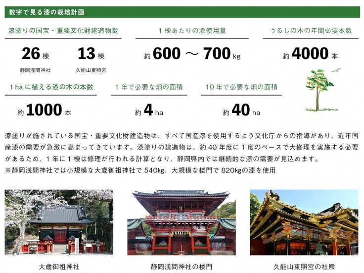 また、静岡市は漆塗りが施されている国宝・重文の文化財建造物を約40棟と数多く有している都市であり、文化庁がその修理に原則「国産漆」の使用を推進していることから、今後大量の国産漆をいかに安定的に確保するかが課題となっています。国産漆は、今でさえ市内はもとより県内にすらほとんど回ってきません。