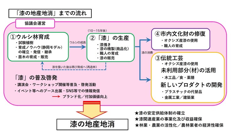 市内に所在する数々の文化財建造物の維持に必要な「漆」を、人口減少に悩むオクシズで育て、「オクシズ産漆」として商品化し、地産地消サイクルの構築による地域活性化と、文化財の維持という複数の課題を解決する取り組みとしていきます。