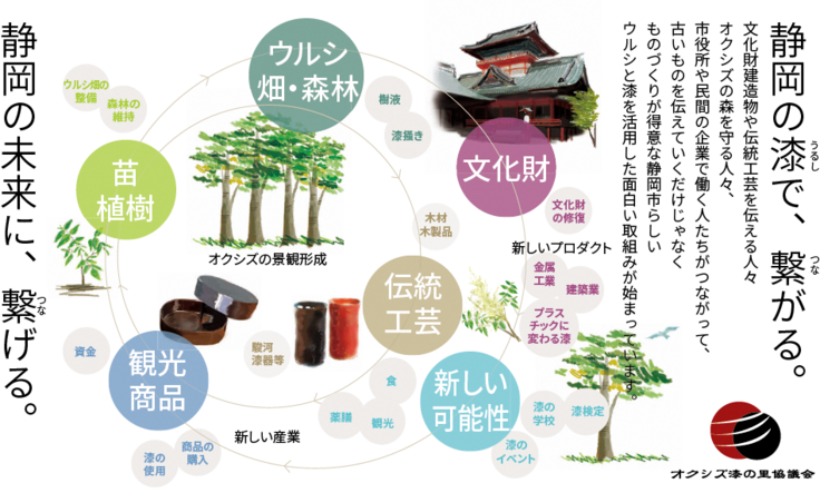 静岡市内の中山間地「オクシズ」でウルシを育て、製品化し、市内の漆塗の文化財建造物の補修等で消費する「漆の地産地消」を目指す「オクシズ『漆の里』協議会」と申します。当協議会は、林業、文化財、伝統工芸、地場産業、行政各関係者など、漆の地産地消に関わる「上流から下流まで」のメンバーで構成されており、平成31年3月に設立しました。 活動内容としては、 ・オクシズでのウルシの栽培方法確立のための試験植樹 ・漆に対する理解や関心を深めるための講演会やワークショップの開催 ・人材育成・技術継承のための映像記録保存 ・未利用部分である材を活用した商品開発 その他、取組みへの理解や周知を図るため各種イベントへのブース出展やFacebook、HP等での情報発信を実施しています。