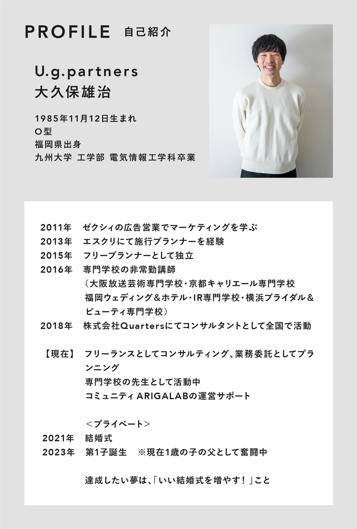 /リクルート⇒エスクリ⇒フリープランナー⇒式場コンサルを経験/シンカ系サロン・ARIGALAB・ぱっしょん会/結婚式の本質を追求/得意なことはチーム作りとモチベーションアップと人繋ぎ/人生は愛と夢でできている/音楽とお笑いを愛する/地元は福岡