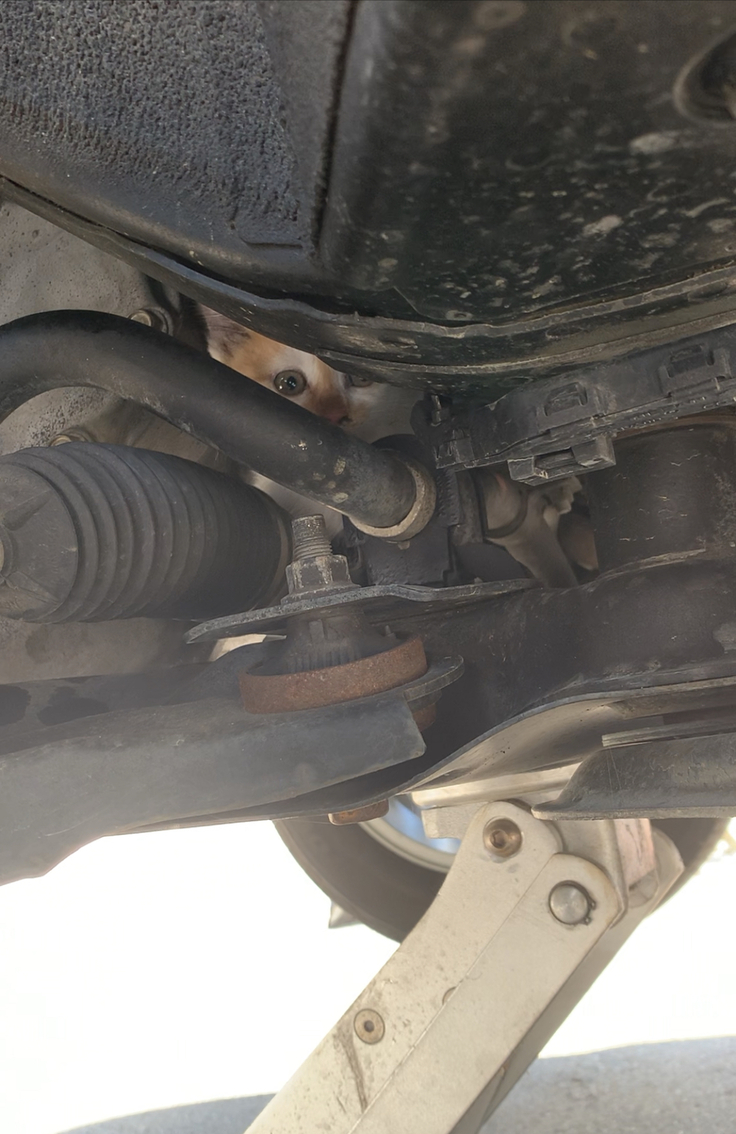 子猫は狭いエンジンルームの隙間から、わずかにしか見えない状態でした。その日は気温も高く、子猫は暑さで弱っているようでした。自動車整備会社の社長さんも駆けつけてジャッキアップするなど、四苦八苦の末、社長さんは指を嚙みつかれましたが、ようやくその子猫を救助することに成功しました。