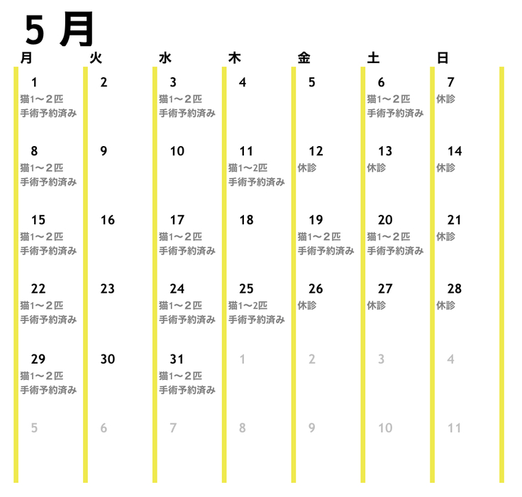 計画では、日に猫を1匹〜2匹程度(合計19匹~程)承諾を得た動物病院の予約日に手術をします。その後の体調を確認してから元の場所へ戻します。