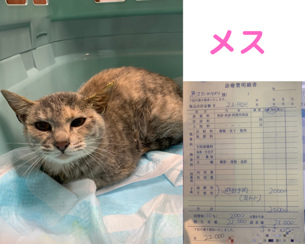 避妊手術と耳カット(さくら猫ともいい、避妊去勢手術済みのしるし)をして、リリースしました。