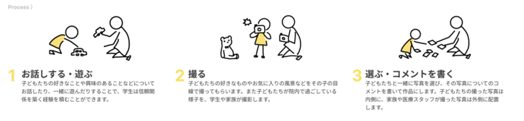 患者さん自身の「内から」の視点と、見守るご家族や医療スタッフの「外から」の視点をそれぞれ写真とメッセージで表現し、展覧会に訪れた人に患者さんの「その人らしさ」を実感してもらう作品をつくります。学生はこのプロセスに伴走し、一緒に作品づくりを行います。作品づくりの過程で患者さんと対話し、想いや考えに触れることで医学生は「人として診る」ことを学びます。