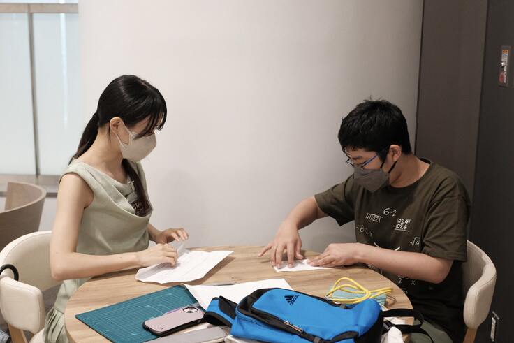 学生メンバー(左)に折り紙を教えてくれているおこげくん(右)
