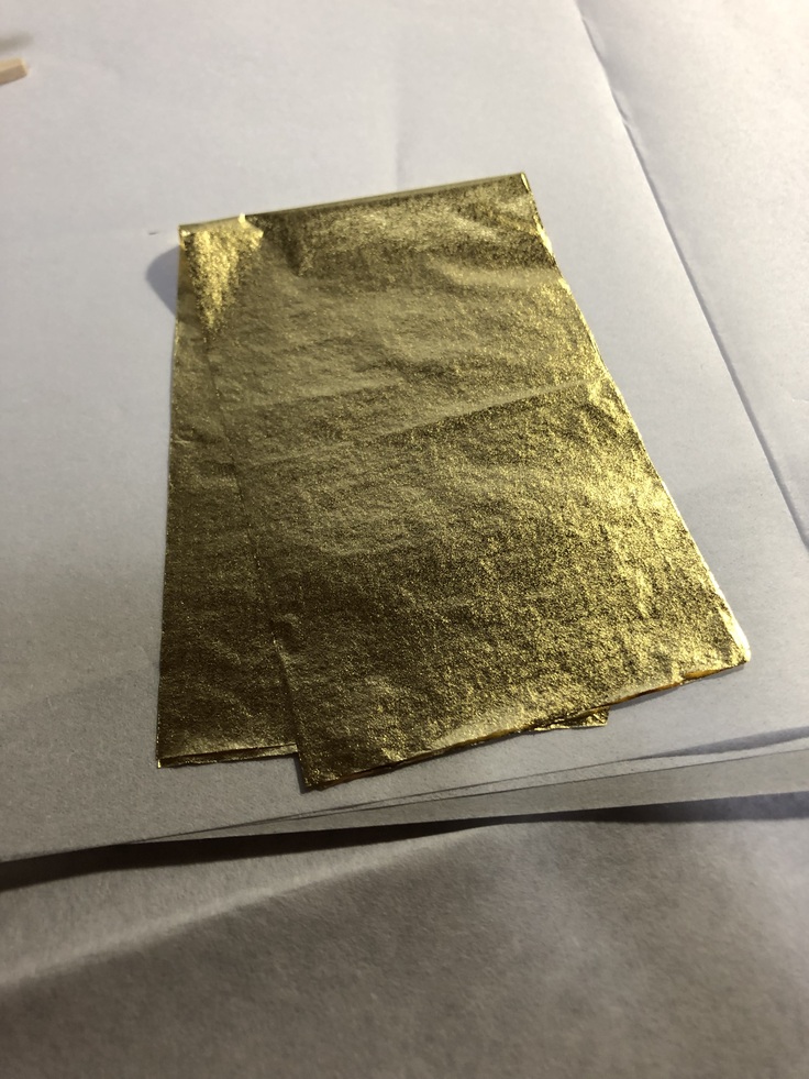 過去に見たこともない1/1,000mmの厚みの金は、鼻息で飛んでしまうぐらい薄く、すぐに破れます。澄みの大きさが190x190mmで、それを169x185mmにカットし、36枚に重ね折りし16x58mmの容器に入れるという、血の滲むような努力が必要でした。