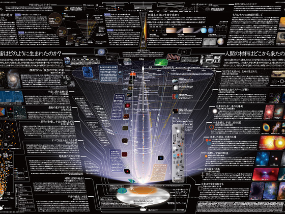 このポスターの制作に参加した研究者たちと半年にわたり数千通のメールを交換し、時には激しい議論を交わしながら、観測と理論によって導き出した宇宙論のモデルをそのままビジュアルに据えたこの「宇宙図」で、今まで断片的な知識だけでは把握できなかった宇宙の進化の姿を目の当たりに理解することができました。