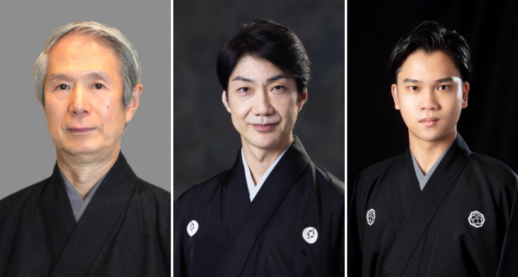 左から、大槻文蔵(人間国宝、能楽師、シテ方観世流)・野村萬斎(能楽師、狂言方和泉流)・大槻裕一(能楽師、シテ方観世流)