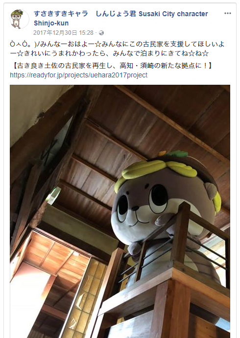 さて、昨年末、市役所の方から連絡があり、今や全国的な人気となっている【しんじょう君】がクラウドファンディングを宣伝してくれるということで上原邸に遊びに来てくれていました!