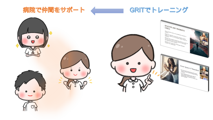 このプロジェクトでは、このGRITの日本版を作成し、それを使用して看護師にピアサポーターとして、ストレス軽減やピアサポートの方法などを学んでいただきます。
