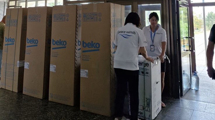 7月8日の攻撃で被害を受けたオフマディット小児病院の患者は、国内外の複数の病院に転院し、治療を続けています。そのうちの一つのキーウ市第一小児病院は、35人を受け入れています。病院関係者から話を聞いたところ、入院患者が増えたことで冷蔵庫やボイラーが不足し、食品衛生管理などで支障をきたしているとのことだったため、ピースウィンズは18日、冷蔵庫5台とボイラー5台を病院内に設置しました。
