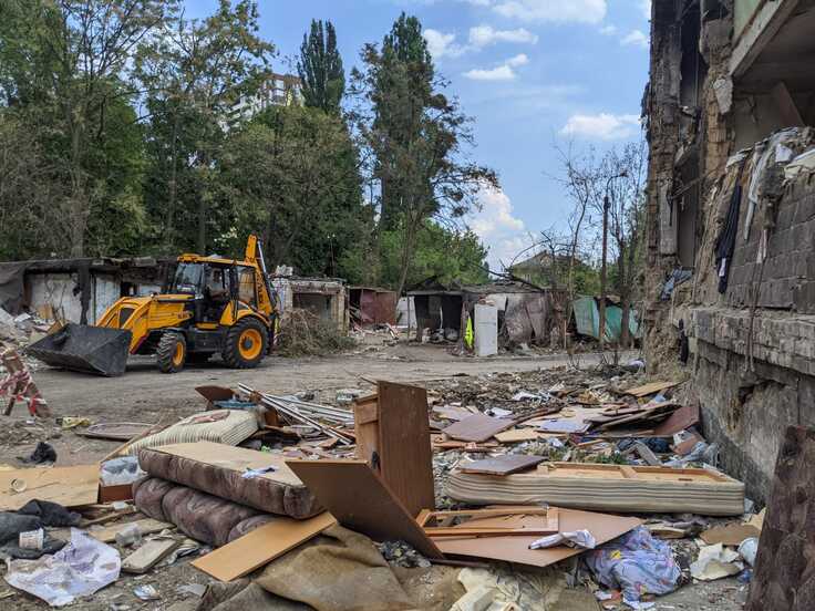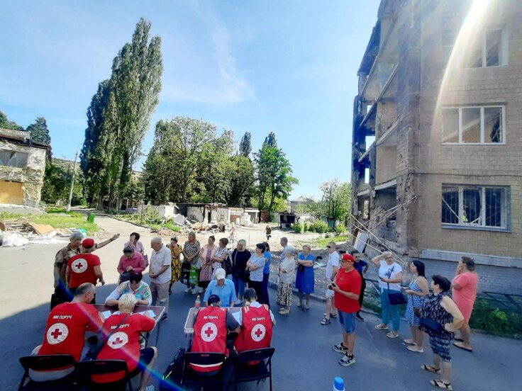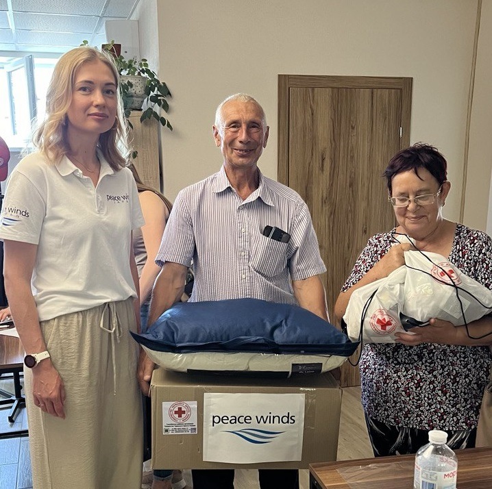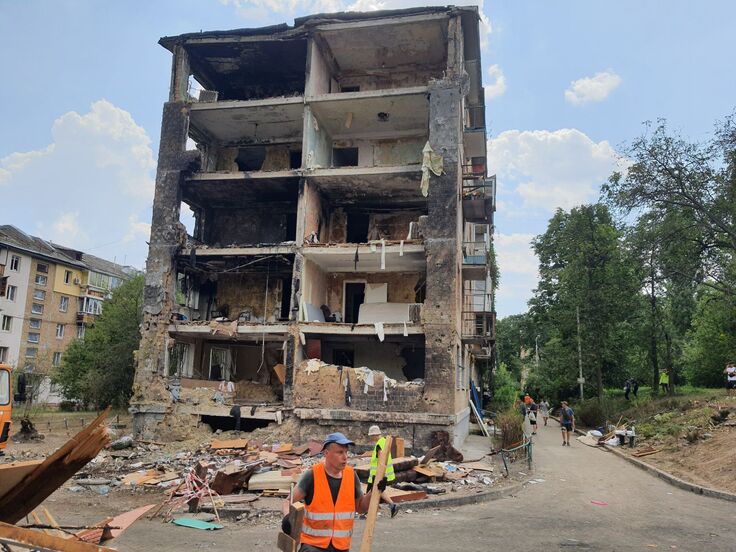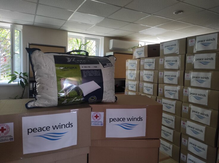 7月8のロシア軍によるキーウへの大規模攻撃では、市内10地区のうち7地区が標的となり、100人以上が死傷しました。その一つのホロシフスキー地区では、ミサイル攻撃により集合住宅7棟の壁や窓などが吹き飛び、300戸に被害が及びました。ピースウィンズは8月24日と28日、ウクライナ赤十字とともに被害者120人に寝具や掃除道具などの支援物資を手渡しました。